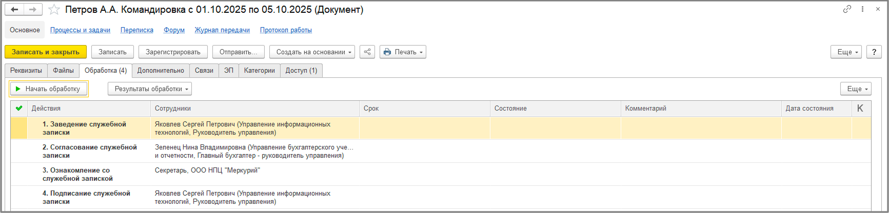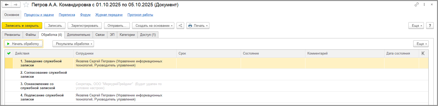 Обработка: здесь видно маршрут документа. После создания документа, система, в соответствии с настройками, передает его по цепочке ответственным сотрудникам.