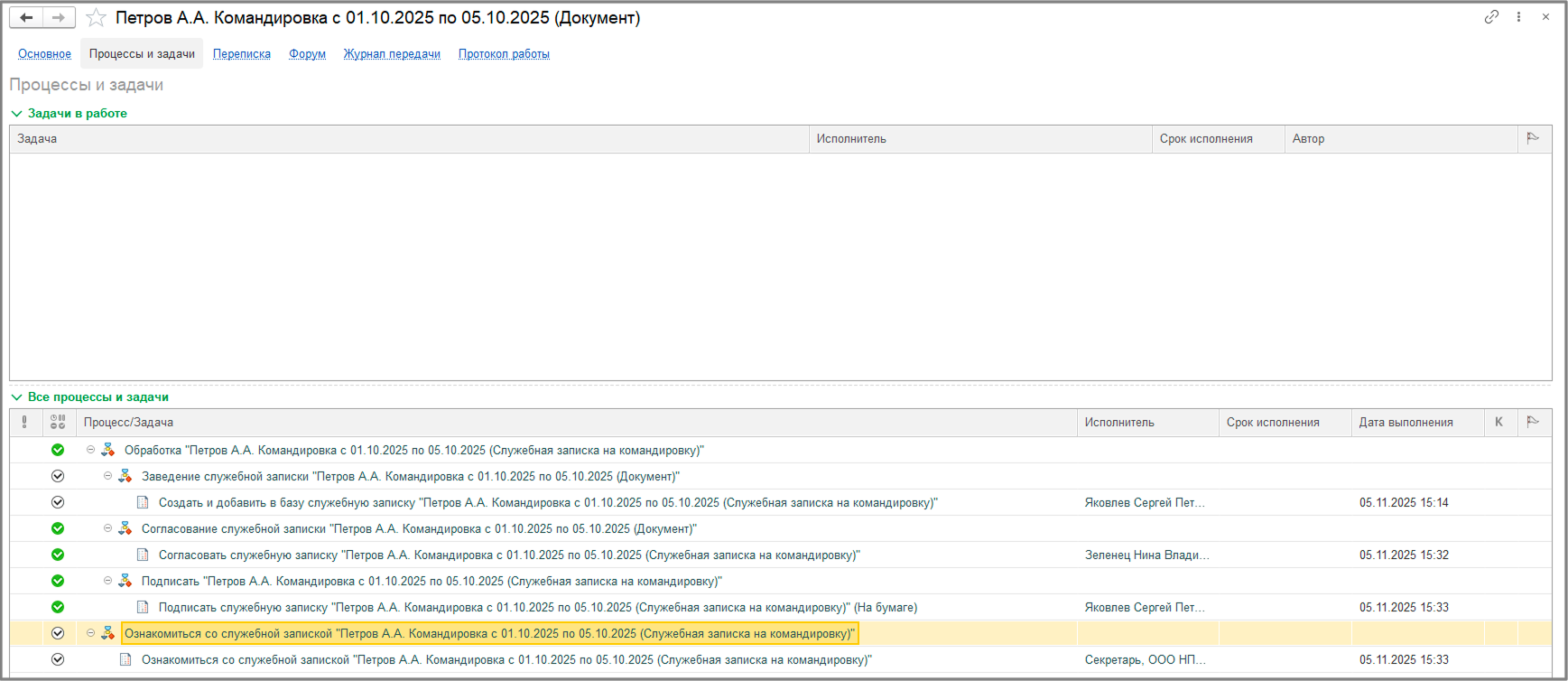 Весь процесс можно отследить в разделе «Процессы и задачи» (рис. 6), где представлено детальное дерево работ по документу с указанием сроков и исполнителей.