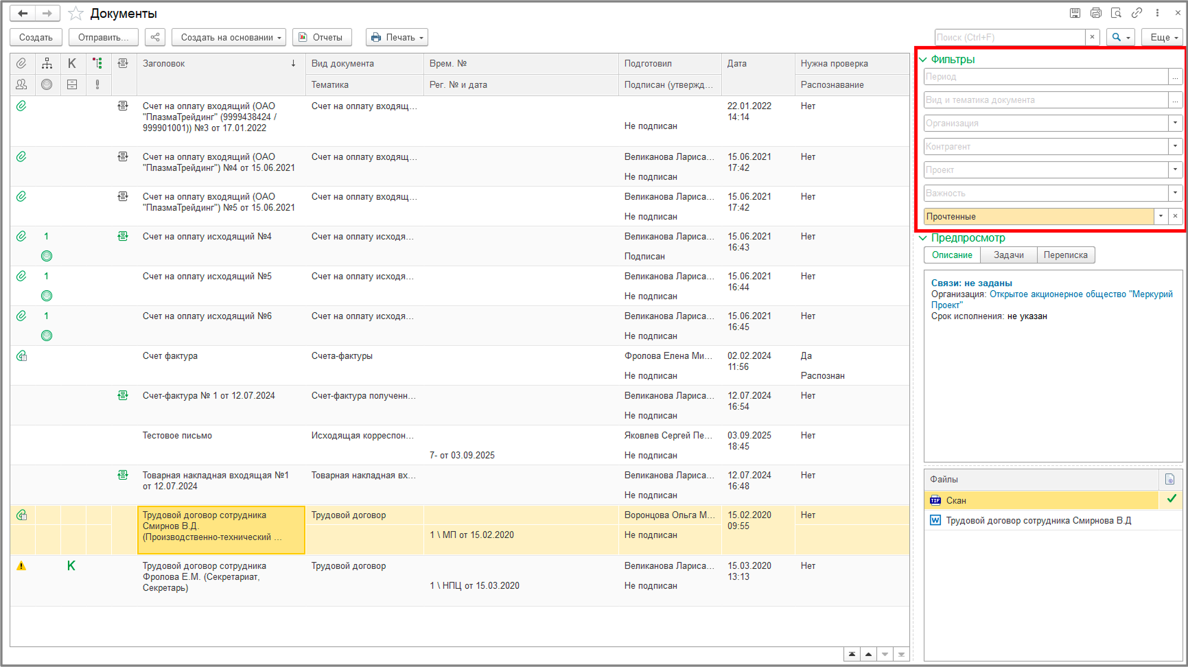 Контроль состояния документов и расширенный поиск можно вести из журнала документов (рис. 9). Здесь можно отфильтровать документы по периоду, виду, ответственному, контрагенту и так далее, либо фильтровать по параметрам через правую кнопку мыши.