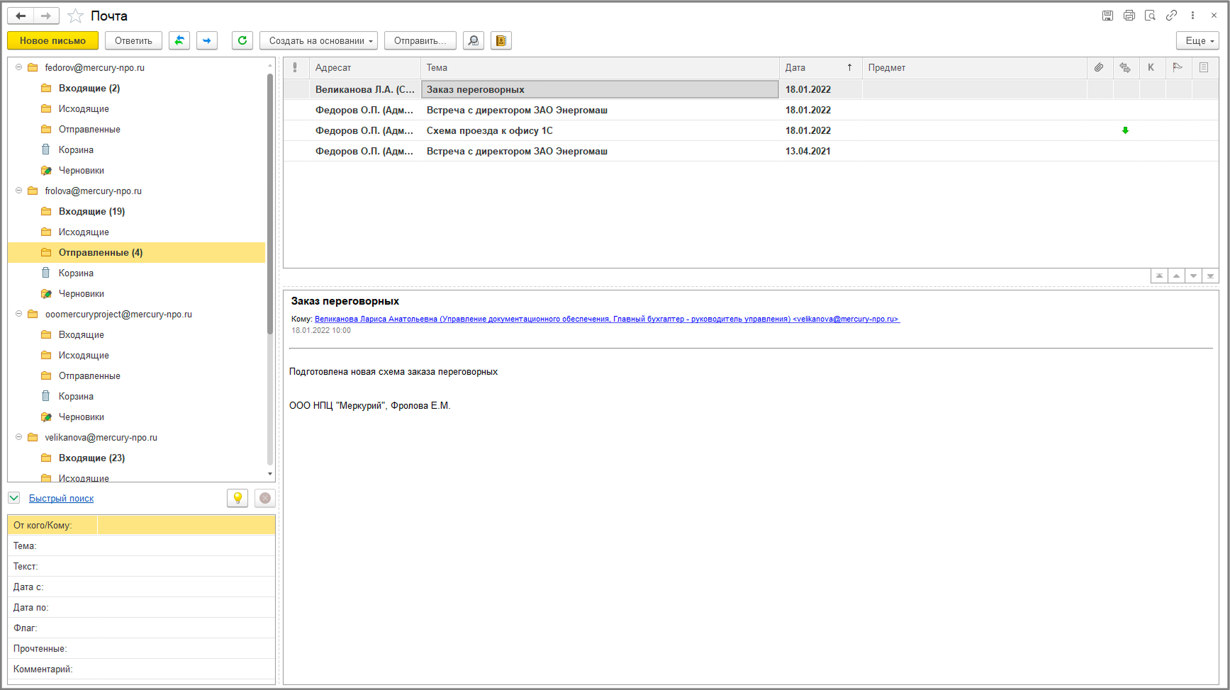 Работу можно вести как через обычный почтовый клиент, так и в связке с карточкой документа.