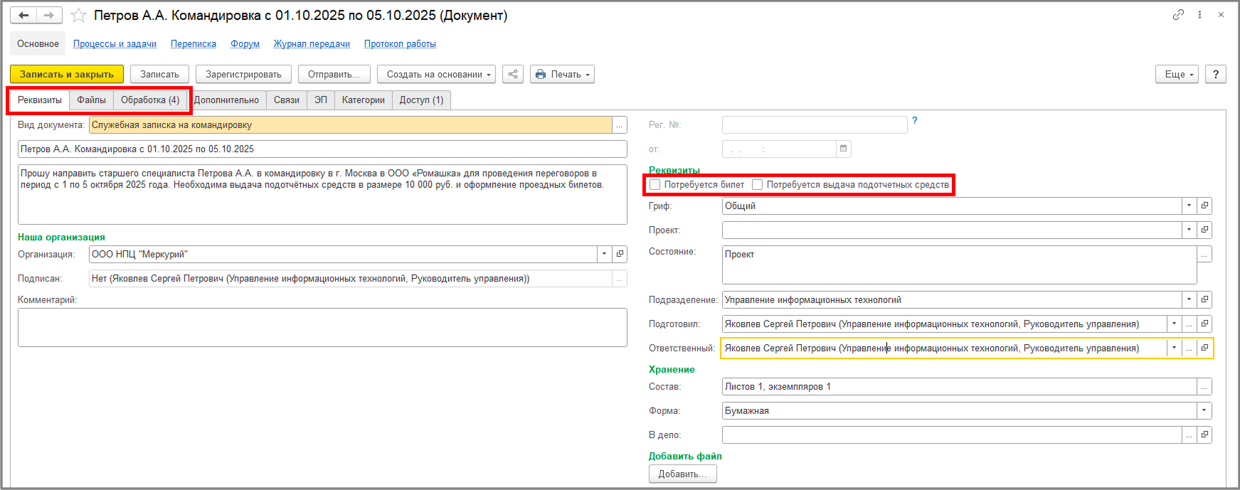 Реквизиты: на этой вкладке отображаются основные реквизиты документа. Состав полей зависит от настроек типа документа и добавленных пользовательских реквизитов. В нашем примере добавлены два флажка: требуется сумма подотчёта и билет.